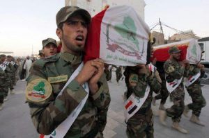 File picture shows members of Shi’ite militia Asaib Ahl al-Haq carrying coffins of fighters from their group who were killed during clashes with militants of the Islamic State, during a funeral in Najaf